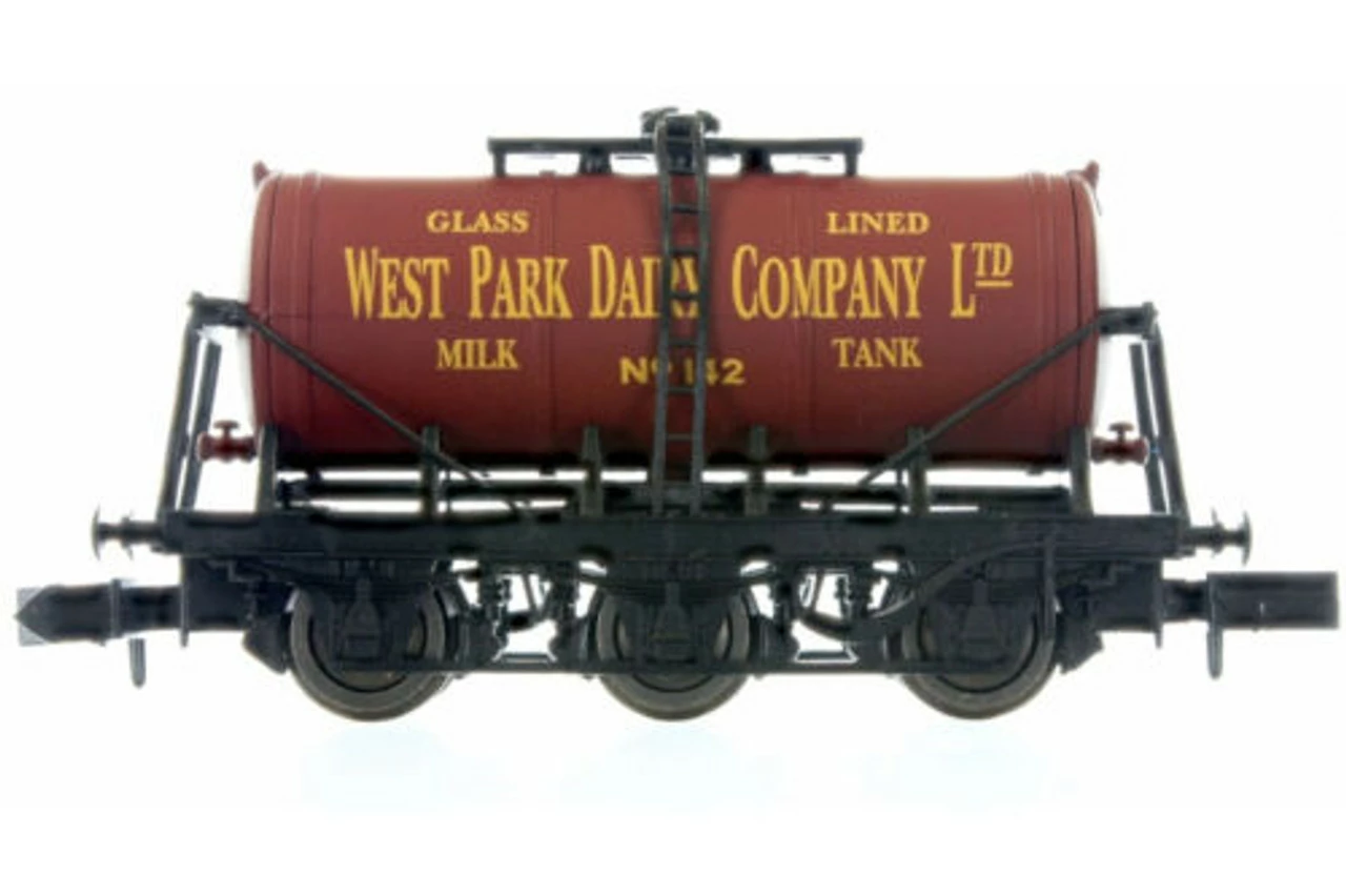 Milk tankers were developed to allow the safe, efficient and fast transportation of large quantities of milk from the country into the towns and cities. Prior to the introduction of rail transportation, herds of cows were kept in cities to meet inhabitant demand and this was supplemented by small amounts of milk transported from the country typically in milk churns. With the advent of rail, the churn was initially still used but transported in larger volumes and more efficiently by slatted goods vans such as siphons. As locomotive design progressed and their haulage capacity increased milk tankers were developed which carried milk in bulk and bore the liveries of the dairies and producers. The ownership of these tankers was unusual in that it was shared, the tanks themselves were owned by the producers and the chassis by the rail companies. There were many variants of milk tanker produced with the Dapol model representing a typical post war variety of which over 600 were produced.