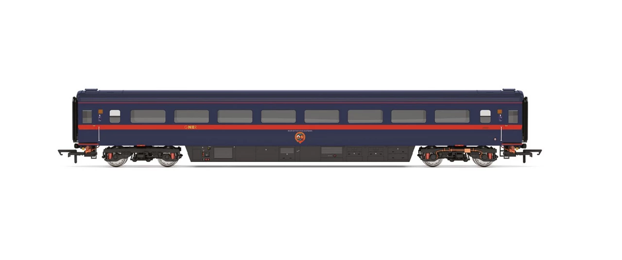 This Mk3 Trailer Standard coach model sports a GNER blue livery and incorporates a ‘Route of the Flying Scotsman’ emblem. The accessory bag contains two magnetic buckeye coupling assemblies and two joined buckeye couplings.