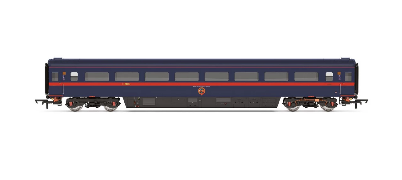 This Mk3 Trailer Standard coach model sports a GNER blue livery and incorporates a ‘Route of the Flying Scotsman’ emblem. The accessory bag contains two magnetic buckeye coupling assemblies and two joined buckeye couplings.