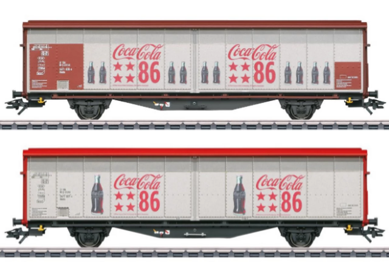 Two type Hbbills 308 sliding wall cars with insulated walls. Here as a Coca-Cola® private car with a special advertising design. Both cars have different car numbers.