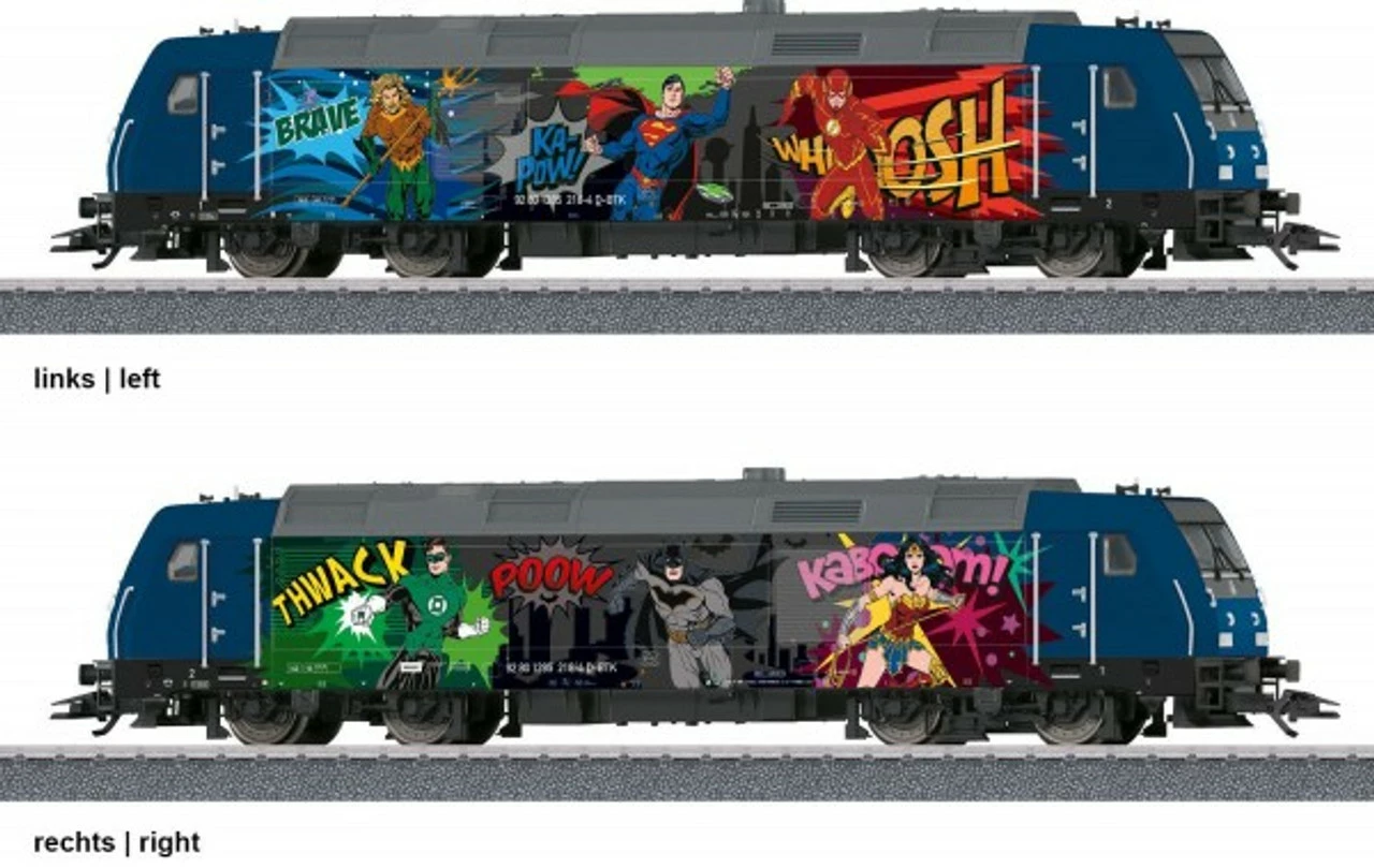 Model: The model is a class 285 diesel locomotive in a great design with different super heroes. The locomotive is constructed of metal with many built-in details. It can be controlled in digital operation and includes light and sound functions. The triple headlights change over with the direction of travel and will work in conventional operation. Warm white LEDs are used for lighting. Two sound functions independent of the locomotive’s speed are included to go with the super hero characters. The locomotive has a digital decoder. One powered axle has traction tires for optimal pulling power. Length over the buffers 22 cm / 8-5/8″.