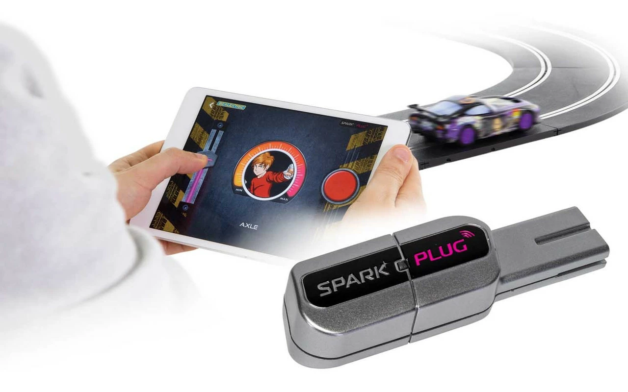 You can now control your Scalextric car from your tablet or smart phone. Spark Plug is the latest innovation from Scalextric which allows you to race your car using your Android or IOS smart device. Simply plug the Spark Plug Wireless Dongle into your Scalextric analogue powerbase instead of a traditional hand controller, download the app and race away with no wires in the way! Watch the video to find out more.